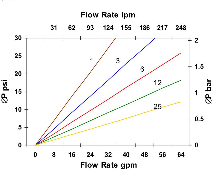 ตัวกรองนี้สามารถใช้งานร่วมกับของเหลวต่อไปนี้แต่การลดลงของความดันจะแตกต่างกันไปขึ้นอยู่กับความหนืดและอุณหภูมิ:
