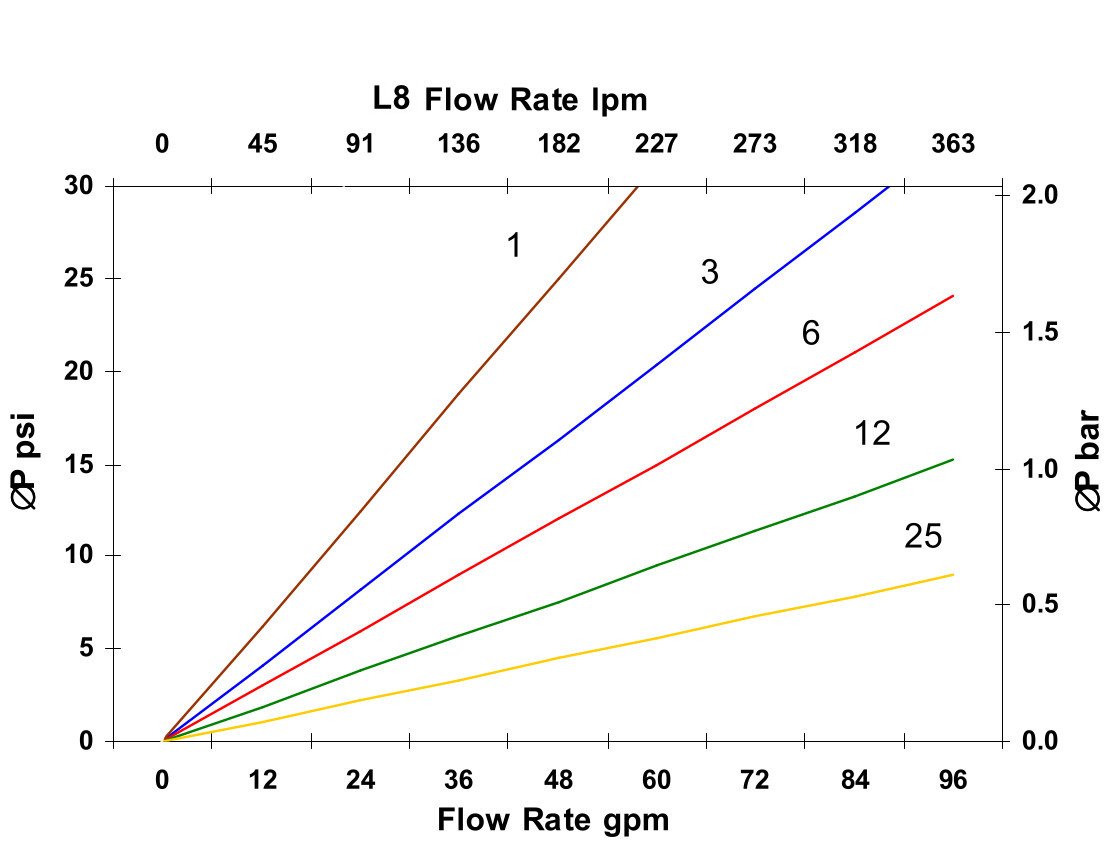 ตัวกรองนี้สามารถใช้งานร่วมกับของเหลวต่อไปนี้แต่การลดลงของความดันจะแตกต่างกันไปขึ้นอยู่กับความหนืดและอุณหภูมิ:
