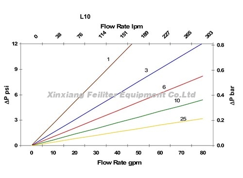 ตัวกรองนี้สามารถใช้งานร่วมกับของเหลวต่อไปนี้แต่การลดลงของความดันจะแตกต่างกันไปขึ้นอยู่กับความหนืดและอุณหภูมิ: